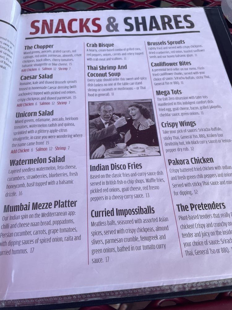 For heartier options, explore the rich and creamy Butter Chicken or the adventurous Kraken Curry, featuring shrimp and chicken in a uniquely ink-black sauce spiked with rum. The comfort of dishes like adult mac-n-cheese and hot chick sandwiches ensures there's something for everyone, including vegan and vegetarian delights. Whether dining with family or friends, the lively atmosphere, coupled with an extensive bar and outdoor seating, makes Exit Zero the perfect spot to enjoy dinner.
